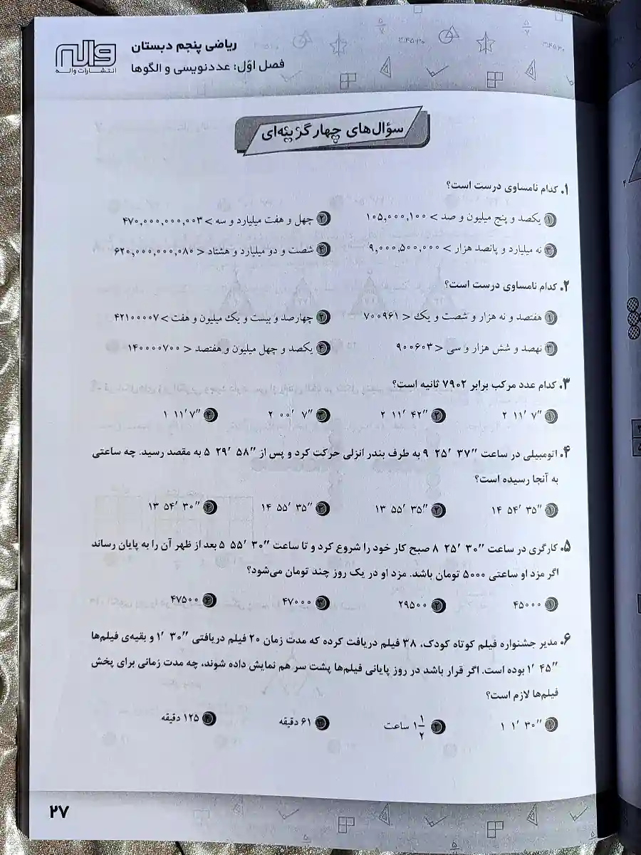 درست میبینید! واقعاً قیمتش همین قدره! کتاب ریاضی پنجم دبستان واله یکی از پرطرفدارترین منابع کمکدرسی برای دانشآموزان پایه پنجم ابتدایی است که توسط انتشارات واله منتشر شده. این کتاب با طراحی جذاب و محتوای استاندارد، به دانشآموزان کمک میکند تا مفاهیم ریاضی را بهصورت مفهومی، آسان و ماندگار یاد بگیرند.